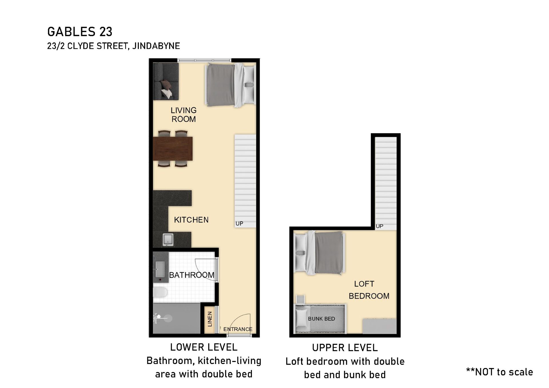 Gables 23, located on Clyde Street, is a cosy loft style apartment located in the centre of town, just a short walk to the lake foreshore, shops and restaurants. Sleeping up to six guests, this second level apartment is perfect for small groups or families.