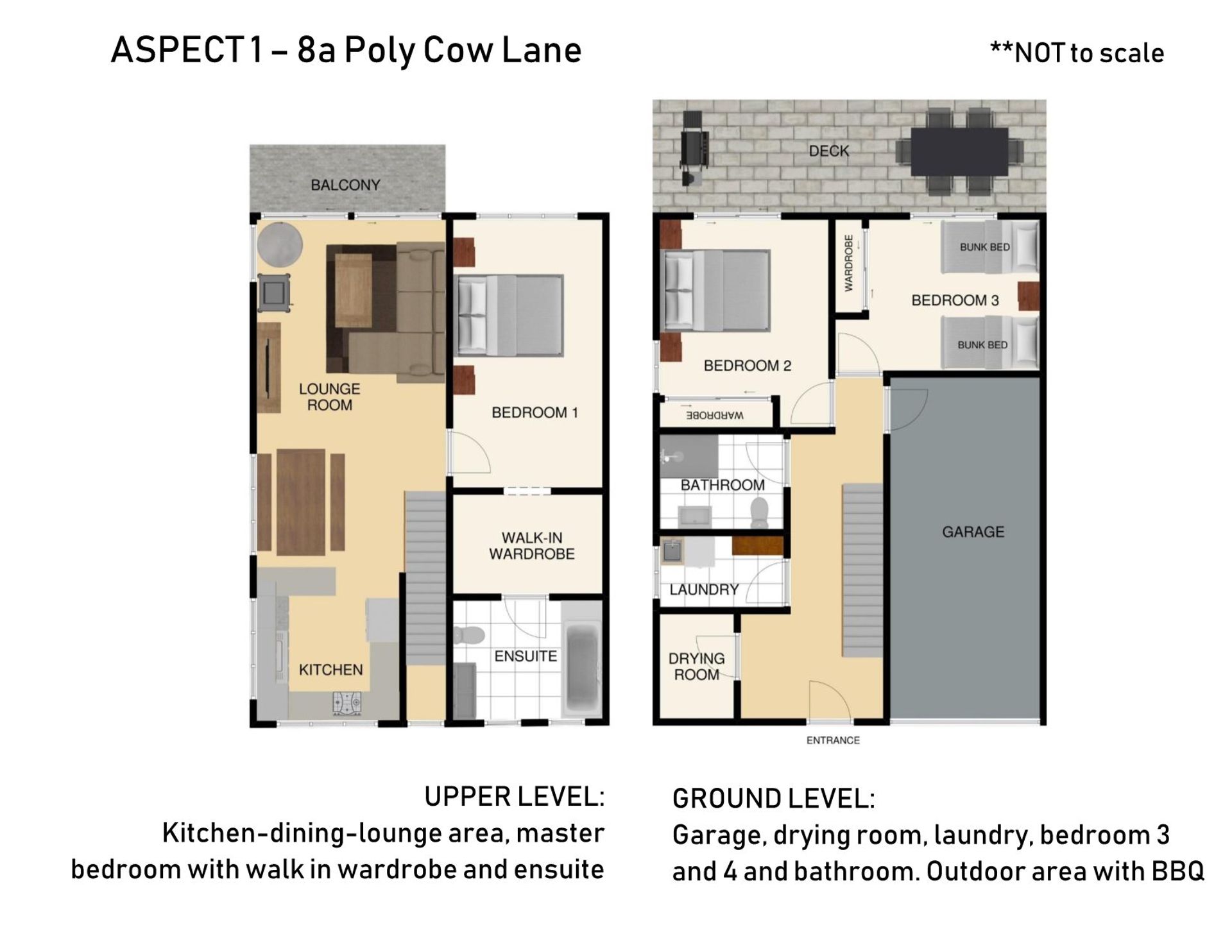 The very large main bedroom upstairs has a queen bed, walk in robe and ensuite, while the ground floor has a bedroom with a queen bed and one with two sets of bunks, a bathroom, laundry with washer/dryer and large drying room with lots of space for ski and room to hang your jackets.