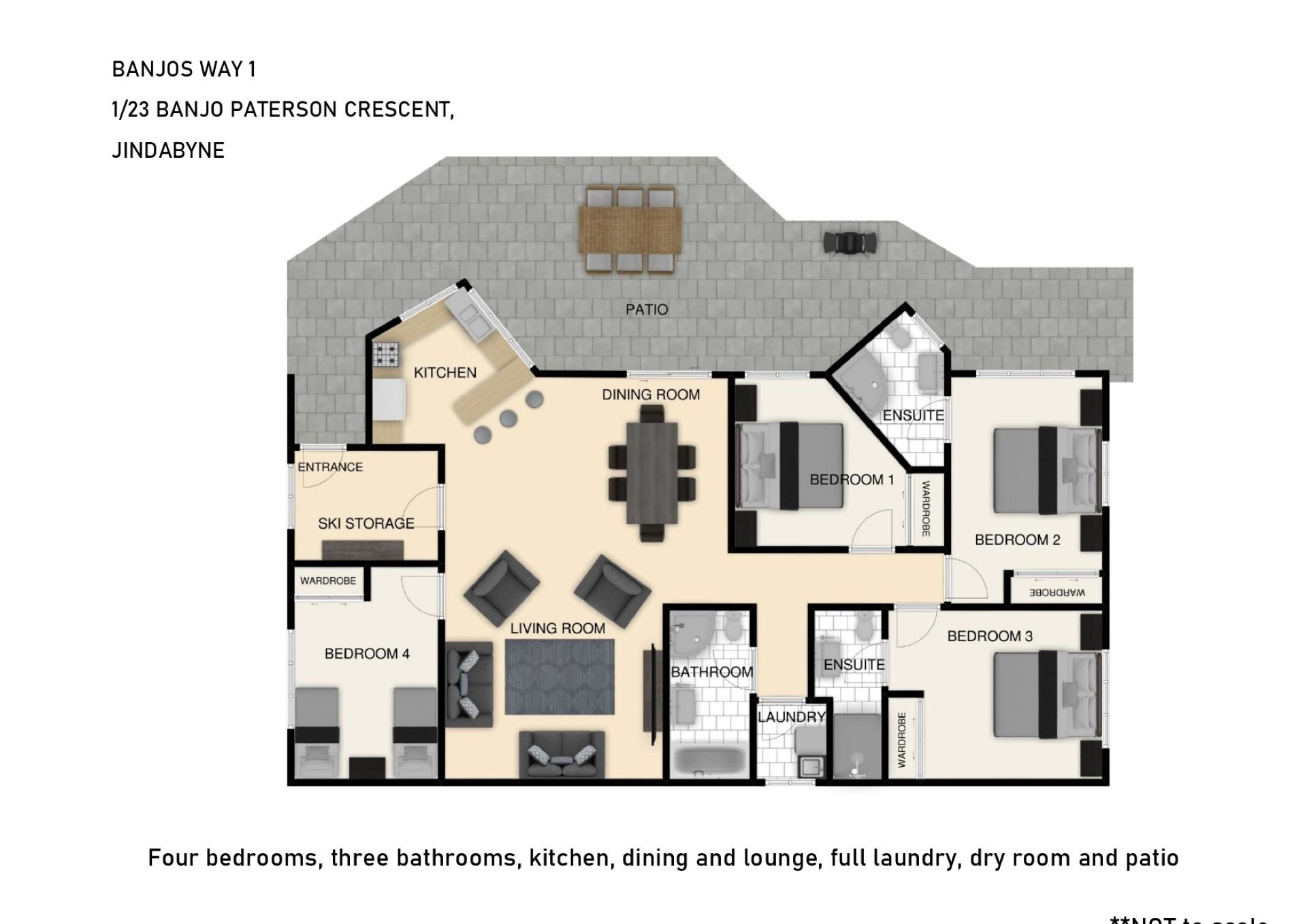 Banjo's Way 1 is a family friendly duplex in a central location on Banjo Paterson Crescent. The property is configured as three king beds and two singles. All beds can be made as kings or single on request at time of booking and has a double sofa bed in the lounge. The property features three bathrooms, one with a bath. Smart TV with Netflix included and free Wi-Fi for guest use. The property is kept cosy and warm with underfloor heating and reverse cycle air conditioning throughout the property.