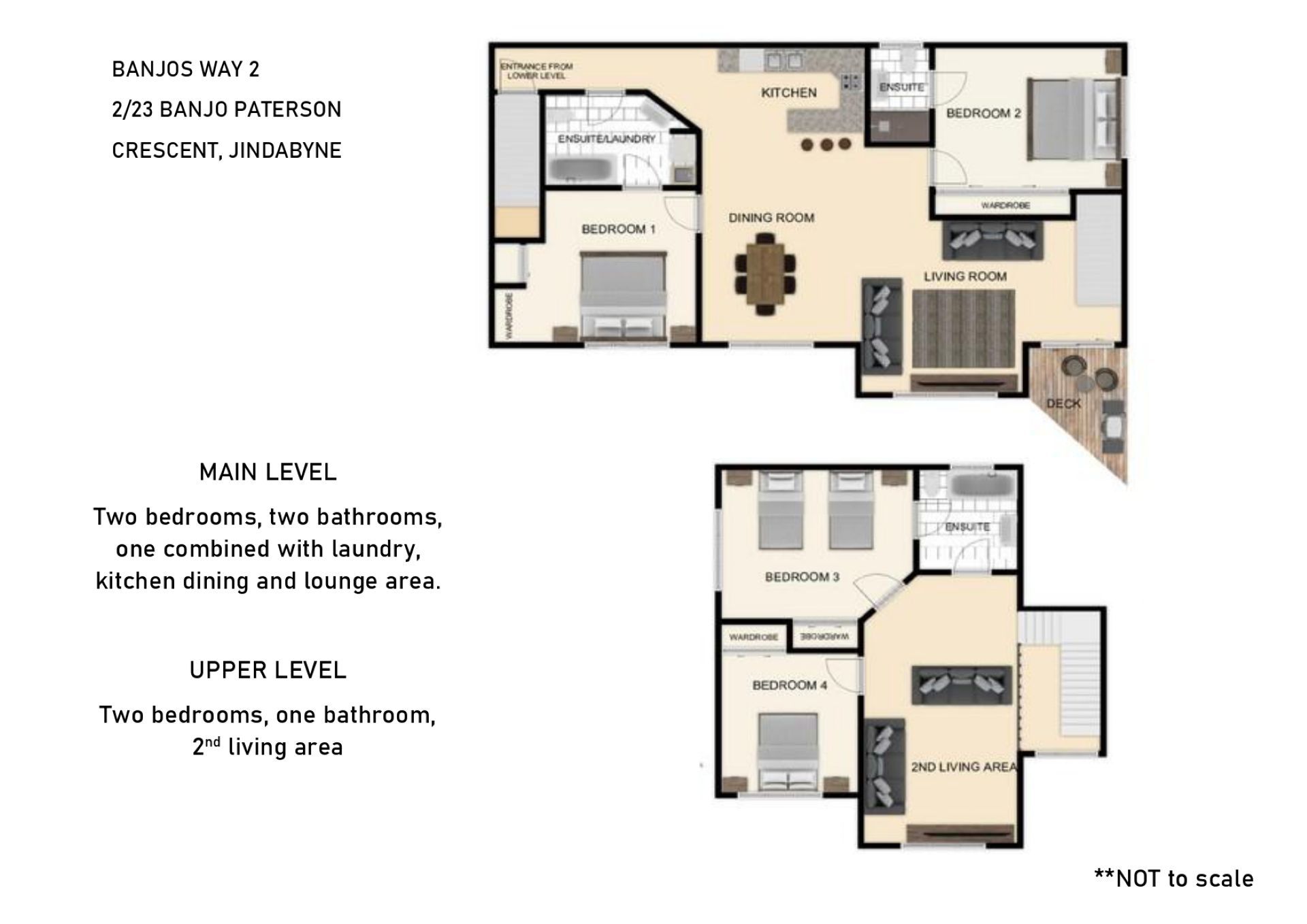 Banjo's Way 2 is a well appointed four bedroom, two living room duplex in a central Jindabyne location. The property is configured as 2 king beds which can be split into singles on request at time of booking, 2 singles that can be made as a king on request at time of booking, 1 double and a sofa bed in the lounge to sleep a total of 10 guests. This property has free Wi-Fi; Smart TV with Netflix available for guest use. Fully appointed open-plan living/dining and kitchen area and a BBQ out on the deck. There are three bathrooms, two with full baths, and underfloor heating and reverse cycle air conditioning throughout the property. Also provided for your convenience is a separate ski storage area and drying room.