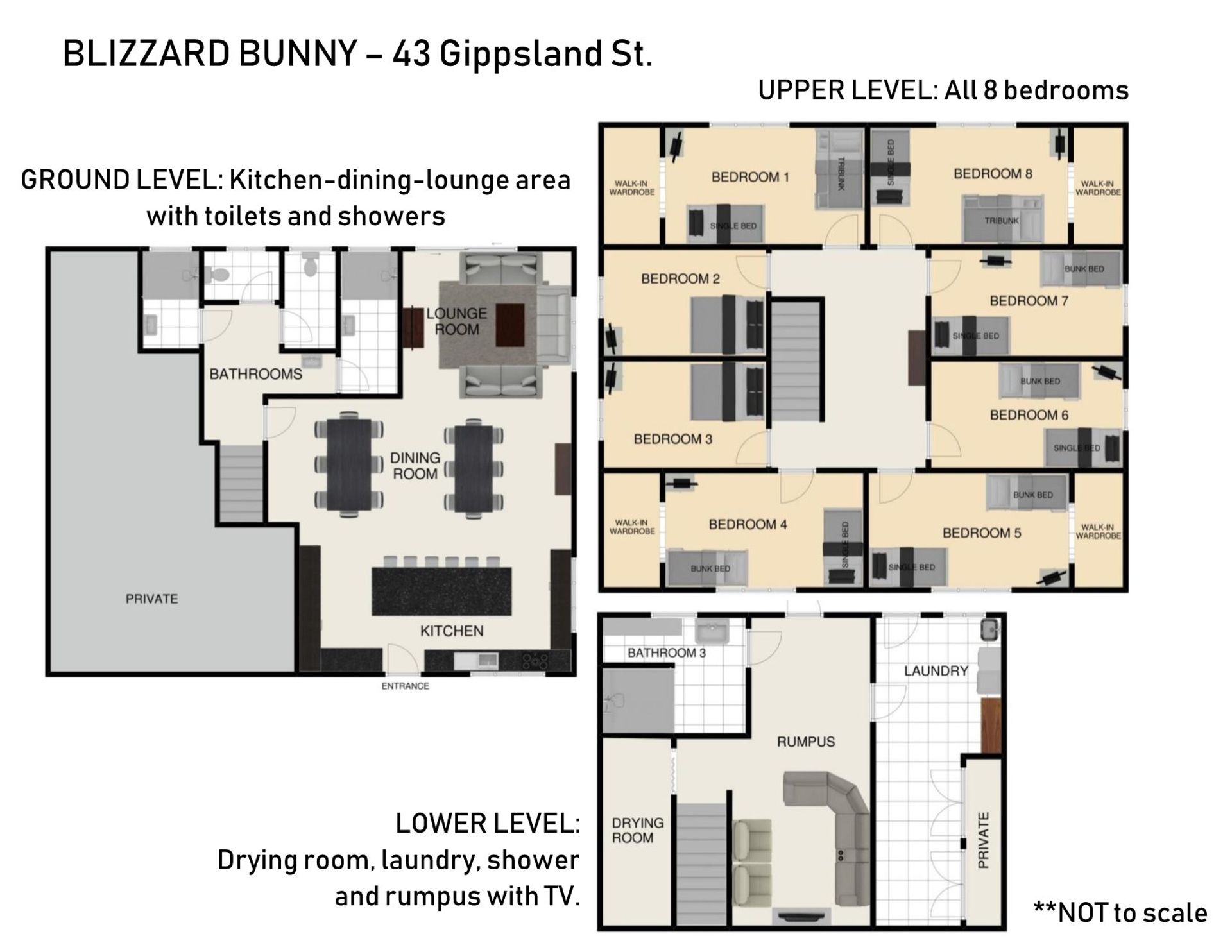 Upstairs you find the eight bedrooms all with TV's & electric heating. Downstairs there is a kids loungeroom as well as a separate bathroom and toilet, large laundry with washing machine and dryer and ski storage. There is plenty of off street parking at rear of property and deck to enjoy the sun.