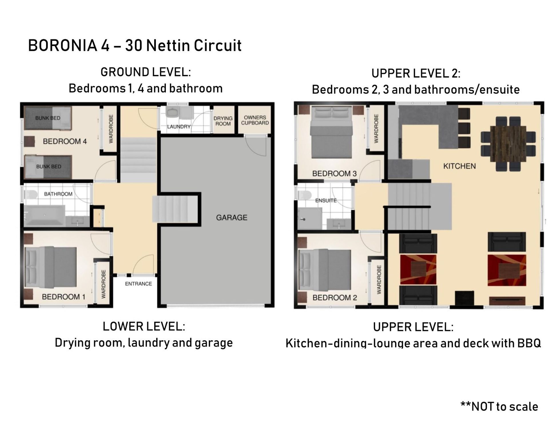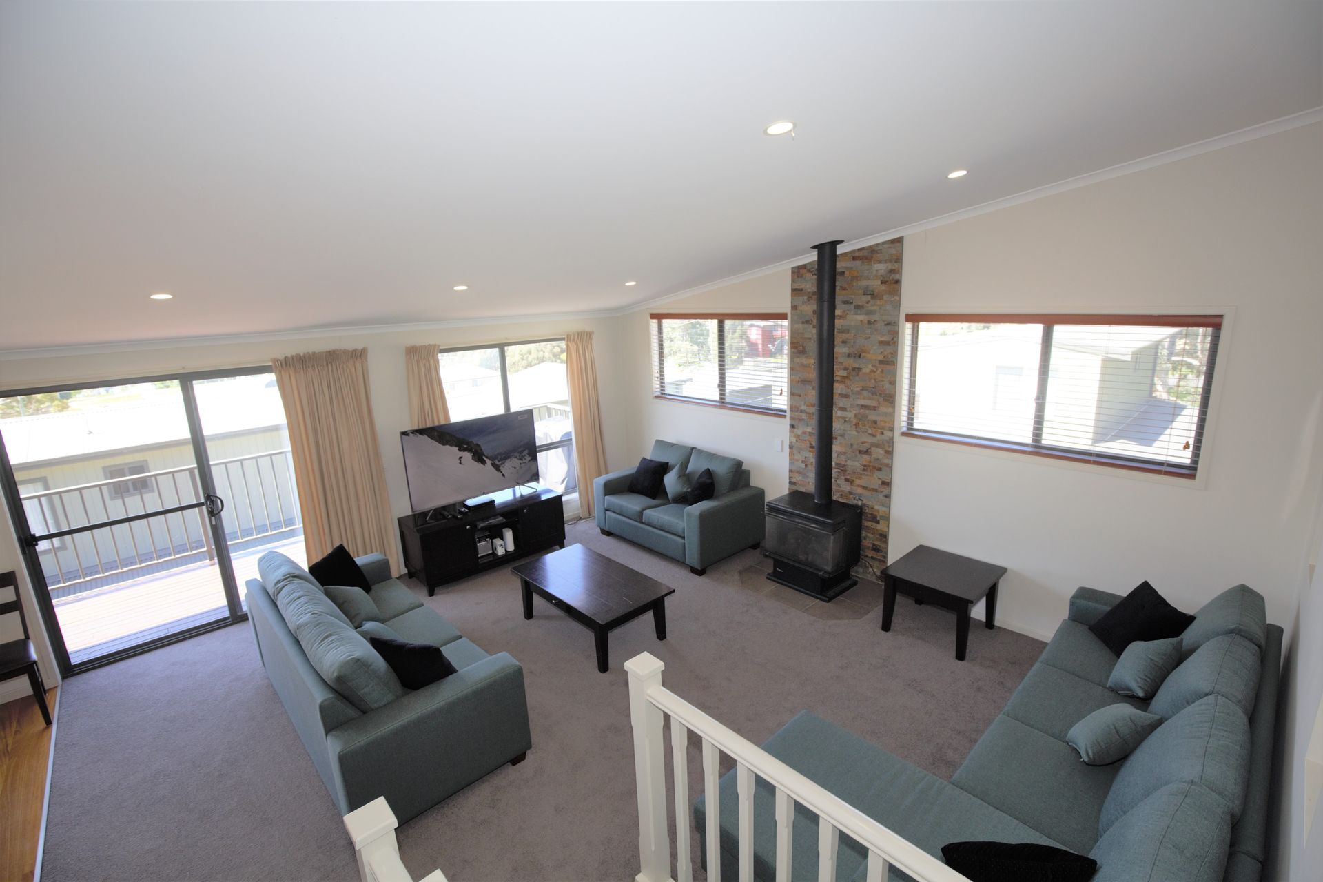 Four bedrooms, three queen bedrooms, (one queen is able to be split into two singles on request), and one with two bunks. Full kitchen facilities with dishwasher and microwave, free Wi-Fi, as well as a BBQ out on the balcony. Lounge has flat screen TV/DVD player, plus gas log fire, also two bathrooms over two levels, one with spa bath. Laundry has washing machine and dryer plus drying room space. Double lock up garage with internal access.