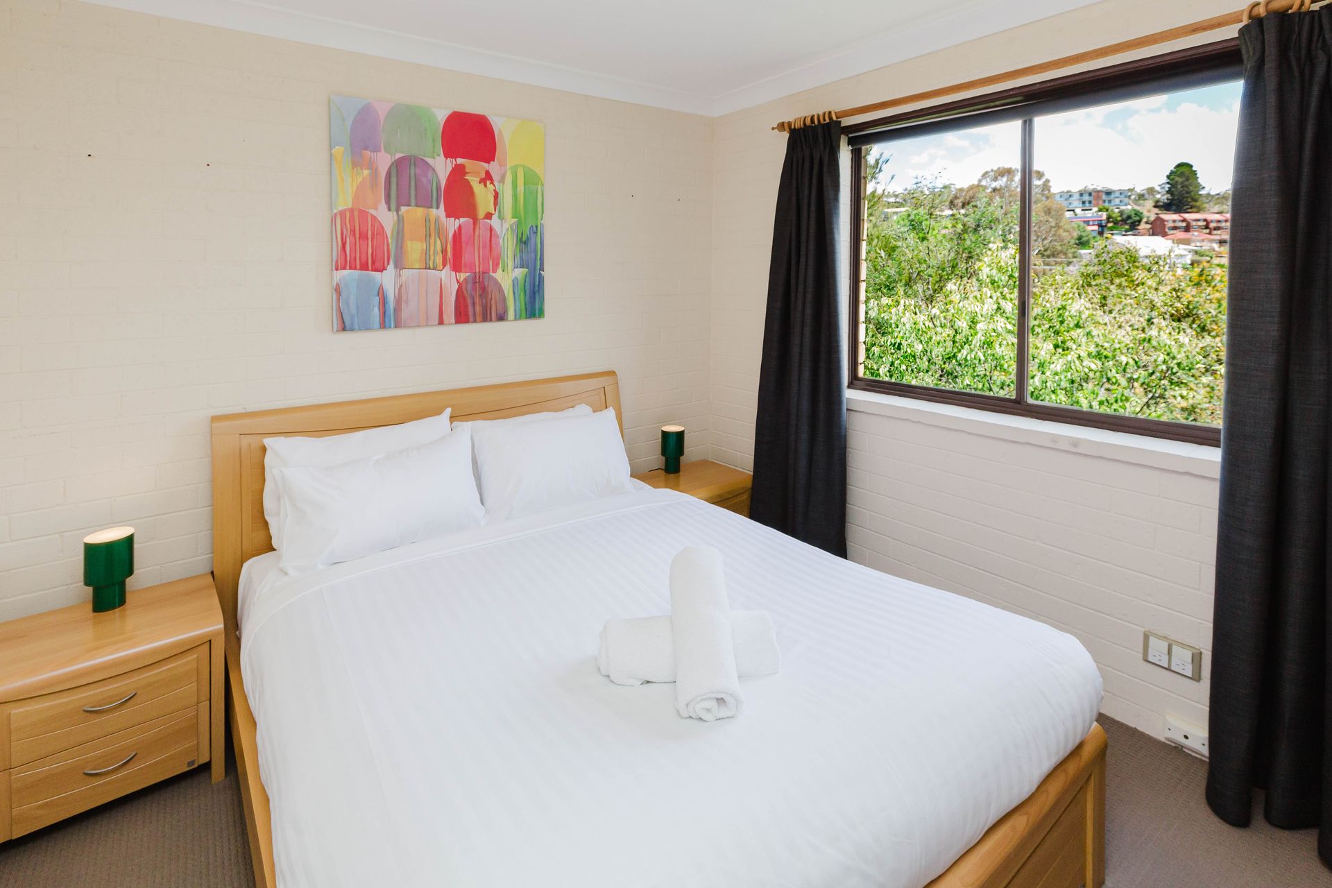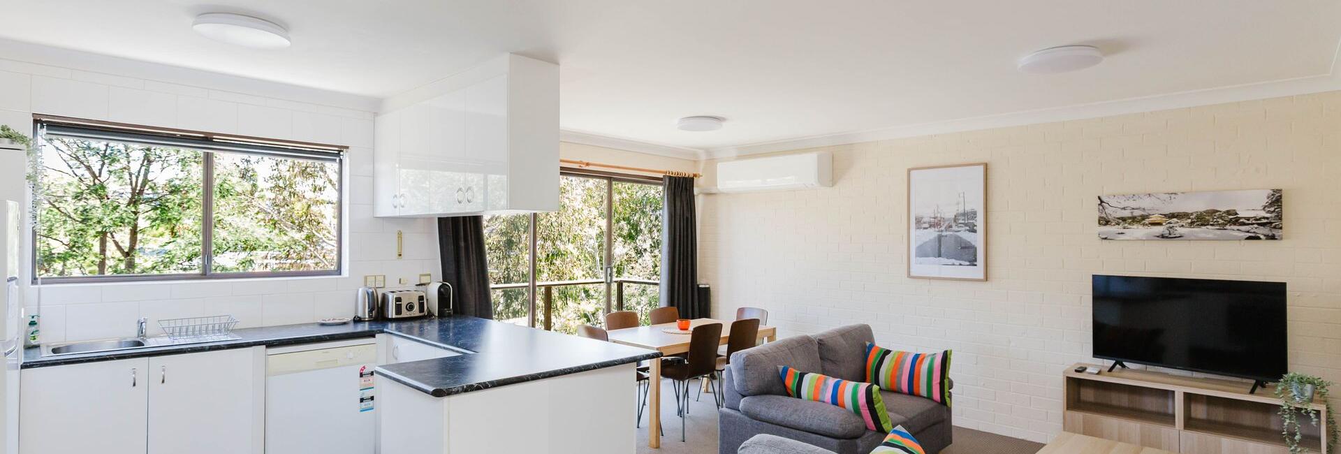 The two bedrooms feature a queen bed in the main bedroom and two bunks in the other, both with built-in wardrobes. The modern kitchen has an electric oven, dishwasher and microwave, and connects to the combined living and dining room. A small west-facing balcony welcomes the sun in the afternoons and opens the living area up in summer, while reverse-cycle air-conditioning will keep you comfortable all year-round.