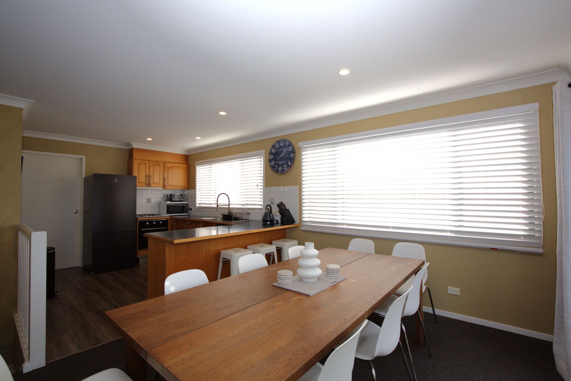 The upstairs level opens to a full kitchen, spacious living and dining, balcony and three bedrooms. The main bedroom has a queen bed, large second and third bedrooms with three singles each. A three way bathroom, full laundry with extra toilet and balcony make this property great for groups. To stay warm the home has electric heating and a wood fireplace for those winter nights.