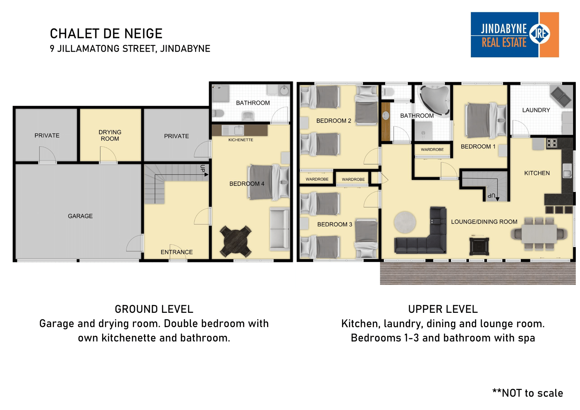 On the entry level you have a double room which is fully self-contained with its own bathroom and kitchenette and double lock up garage with separate ski storage and drying room with boot dryer.