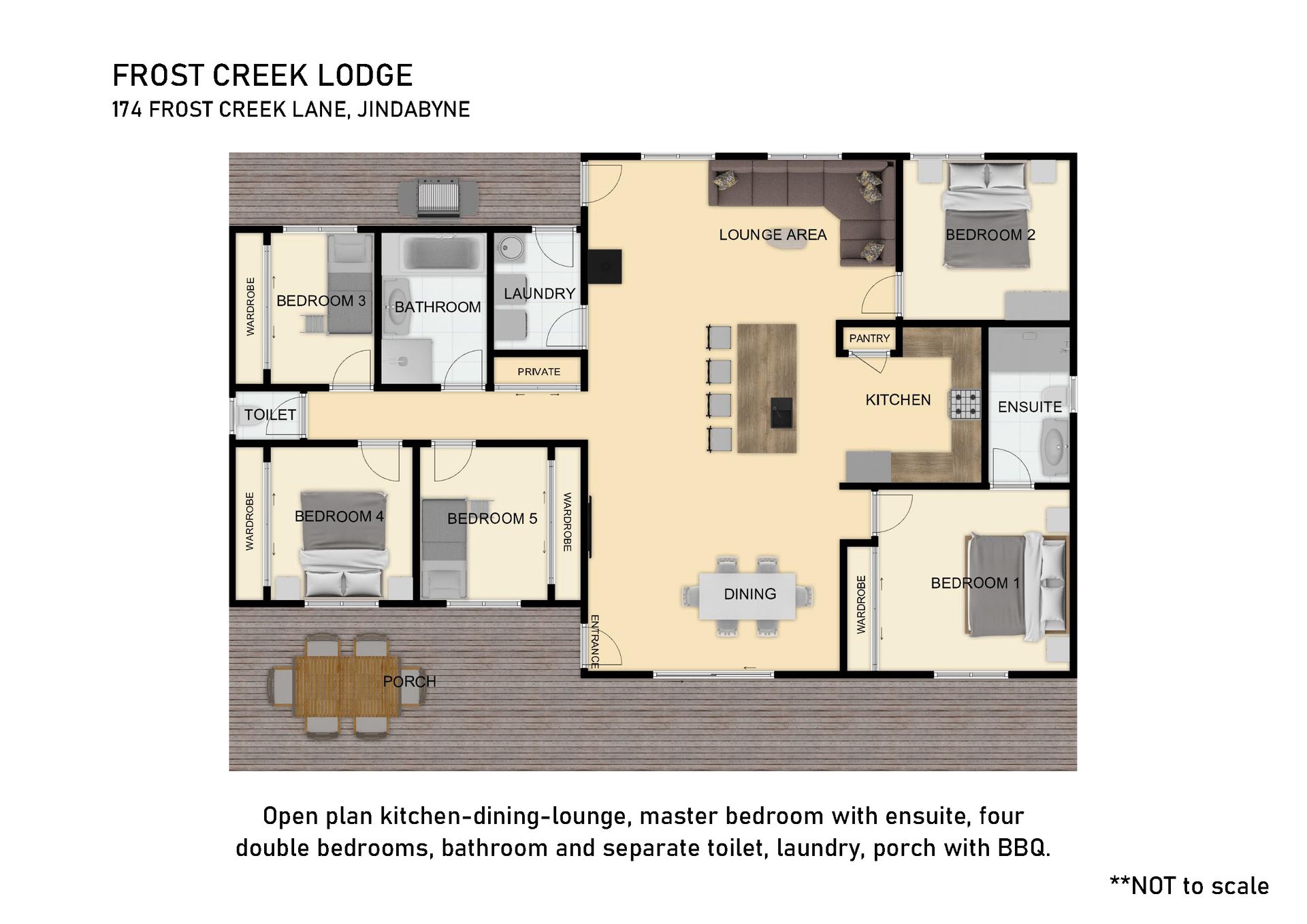 Frost Creek Lodge is a beautifully situated, modern country-style home located on a private crest of 5 acres only a 15 -20 minute drive from the centre of Jindabyne. Perfect for families, this property sleeps up to 10 comfortably in the 5 bedrooms and 2 bathrooms. Relax and enjoy the amazing view of the Snowy Mountains while enjoying the isolated setting, open spaces, and wildlife on the property.