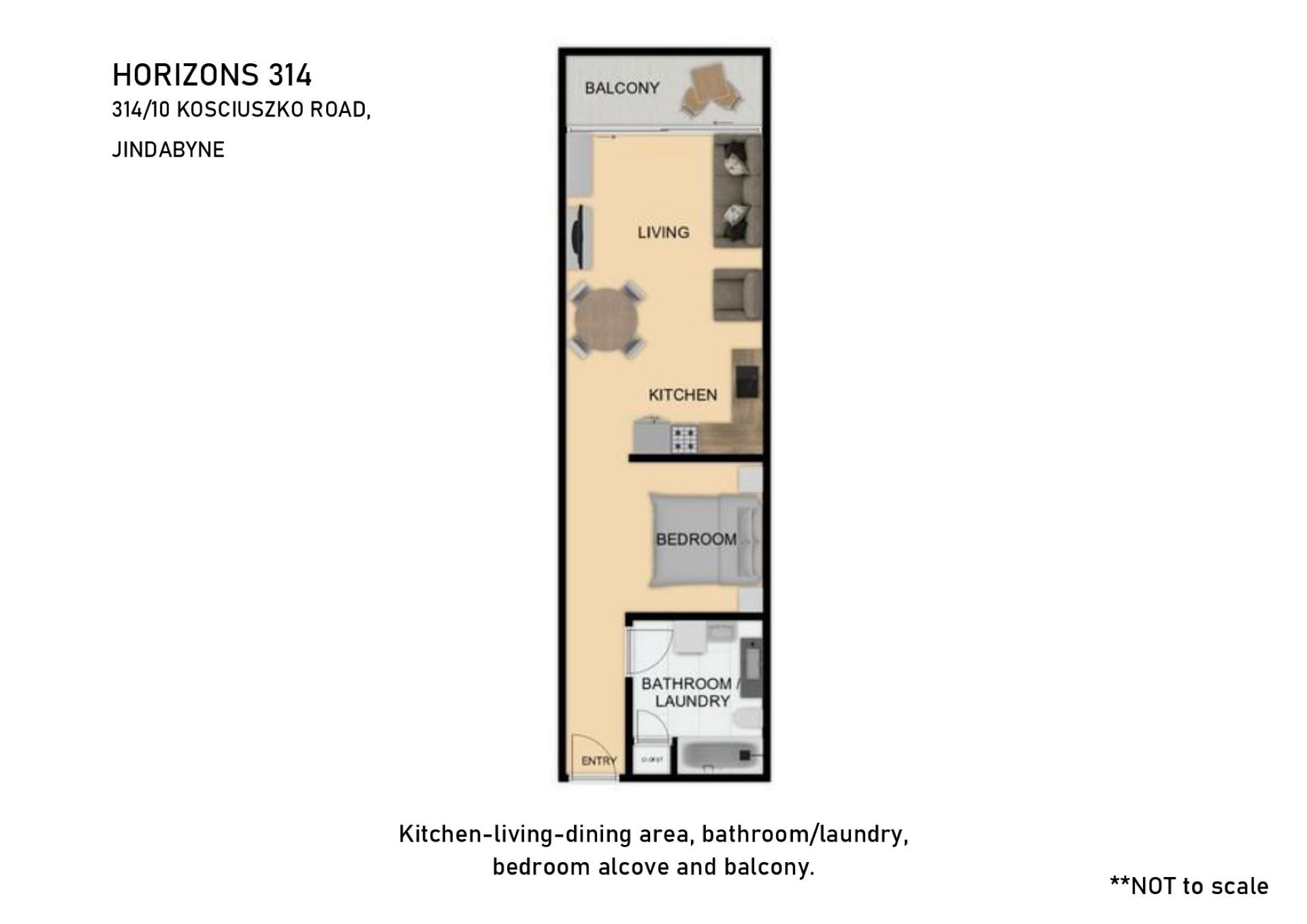 Horizons 314 is a one bedroom apartment located in the Rydges Horizons complex centrally located in the centre of Jindabyne. Bedding consists of a king split (which can be made up as singles by request at time of booking) in alcove and a living and dining area off the kitchen. Property offers full kitchen facilities including a dishwasher, bathroom with full laundry, air conditioning and free Wi-Fi. Guests have access to resort facilities including tennis court and heated swimming pool. A single allocated undercover parking space is provided.