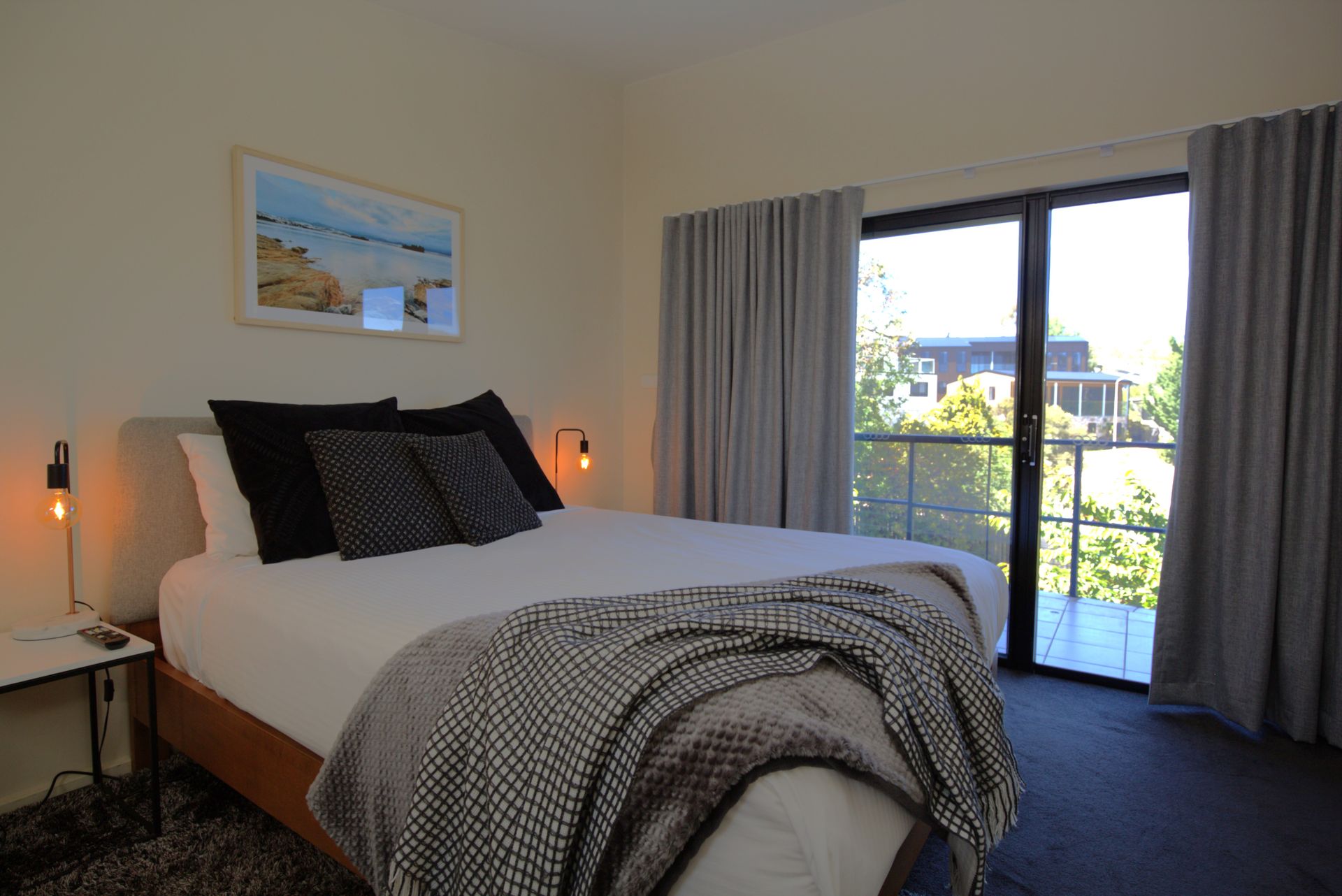 Khione 6 is split level with the middle level having the second bedroom with two king single beds, combined laundry bathroom with a shower and internal garage access. The stairs then lead up to the spacious master loft bedroom which has a queen bed, ensuite with a spa bath and private balcony.