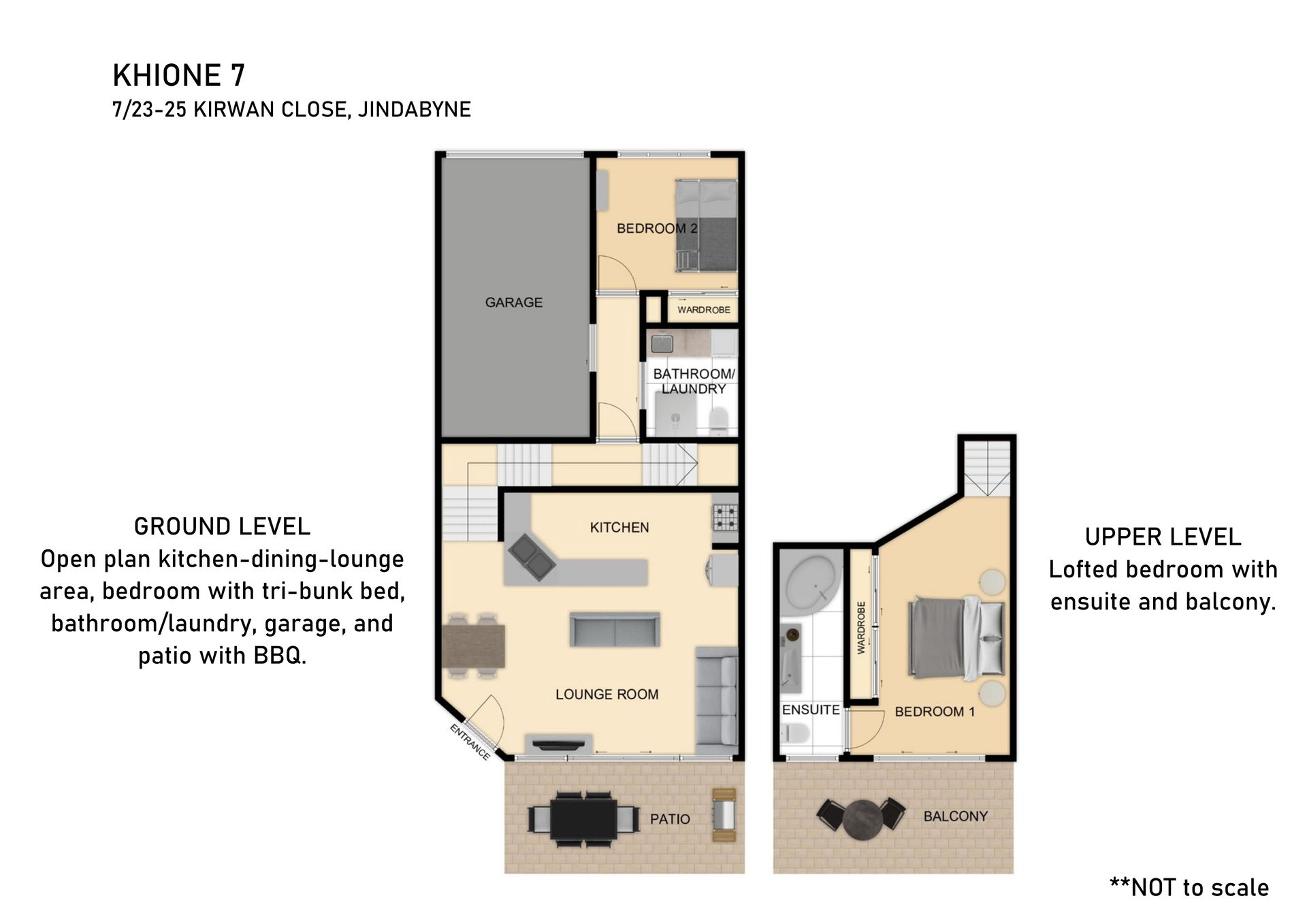 Khione 7 is a modern, split level town house with two bedrooms, two bathrooms sleeping up to five people. The main entrance brings you straight into the open plan living, kitchen and dining areas with access to a courtyard with a BBQ. The kitchen comes fully equipped with modern appliances and a dishwasher, the lounge features large comfortable couches to relax into after a long day on the mountain and Wi-Fi for your convenience.