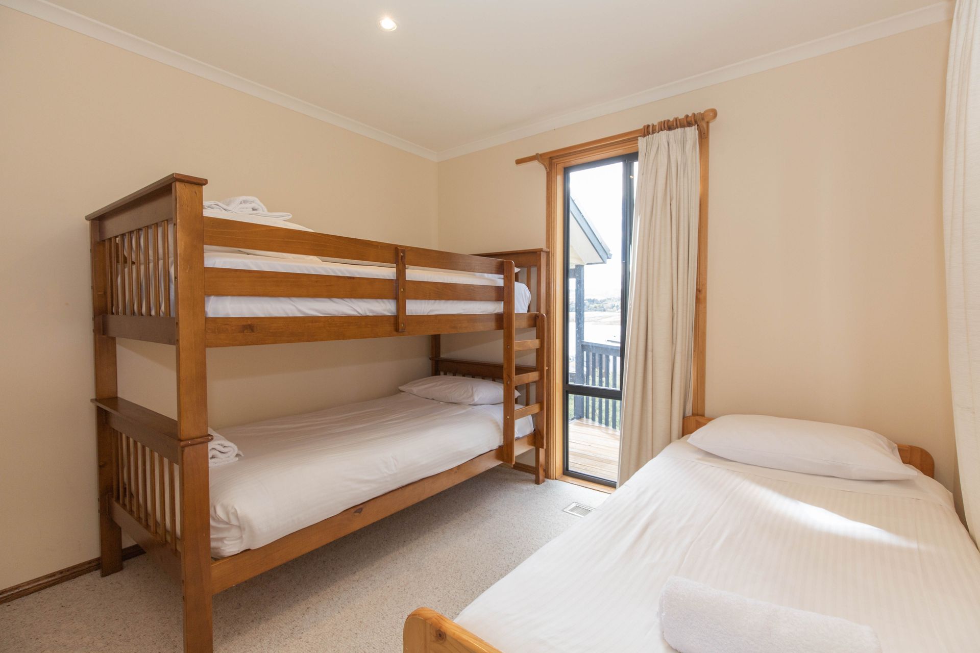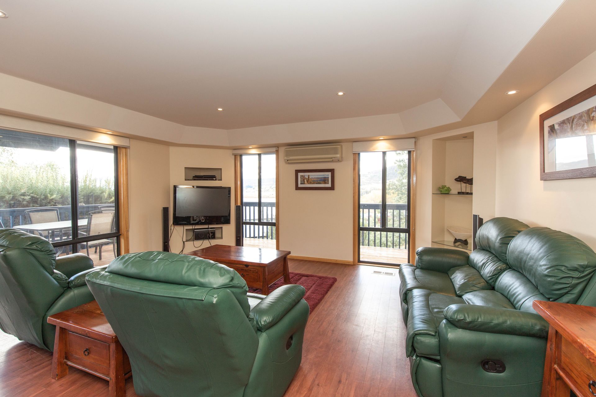 Two of the bedrooms feature queen beds and TV's with their own access to the upper level private balcony which boasts amazing views of Lake Jindabyne, the third bedroom is located on the entrance landing which has a single bed and set of bunks. The kitchen is well equipped including modern appliances and a dishwasher giving you the feel of home. There is reverse cycle air conditioning in the living area as well as the two double rooms, and a laundry with washer and dryer. The property is located close enough that you walk to the lake for a dip in summer, or gaze at the snow capped mountains from the comfort of the outdoor entertaining area in winter.