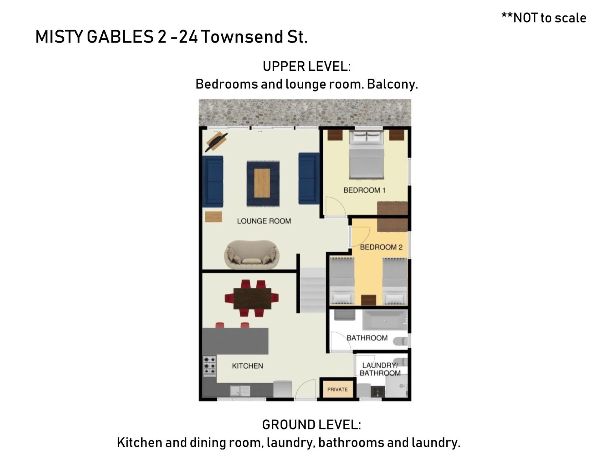 Located on a split level up just a couple of steps is the two bedrooms, one with a double bed and the other has two singles. The loungeroom is a great size for four guests which leads to a balcony. Apartment is located back off the main road and has two off street car spaces.