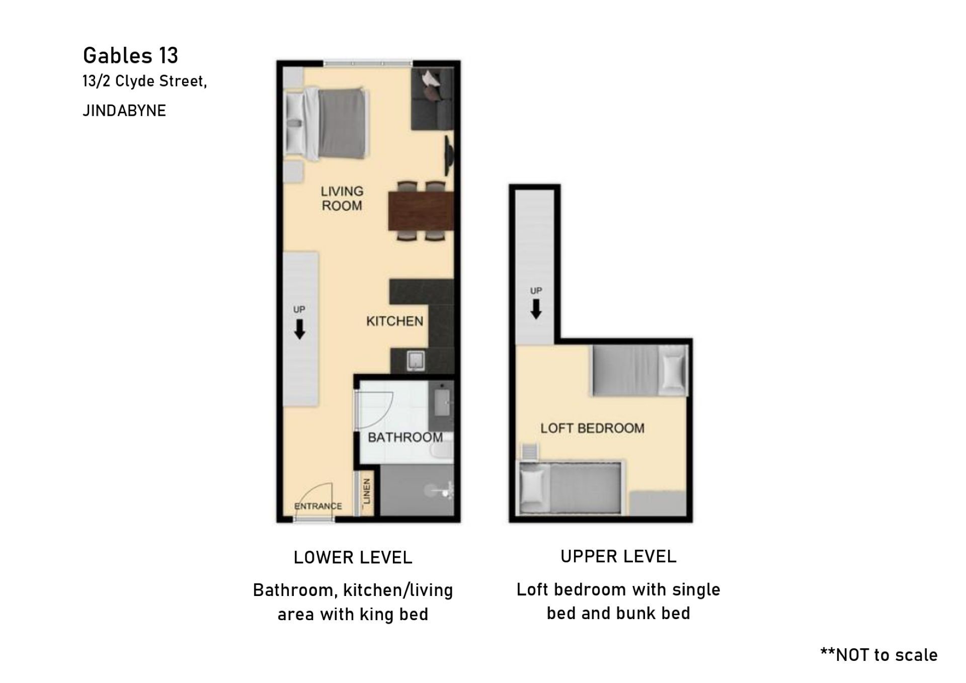 This cosy loft located in the heart of Jindabyne offers a double bed and single bunks in the upper level sleeping up to 5 people. There is a bathroom with bathtub and kitchenette provided with all the basic essentials. This apartment offers the security of being a part of a resort which makes for a comfortable stay.