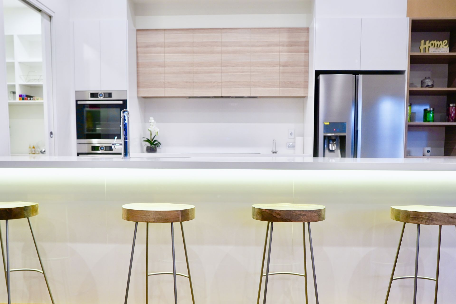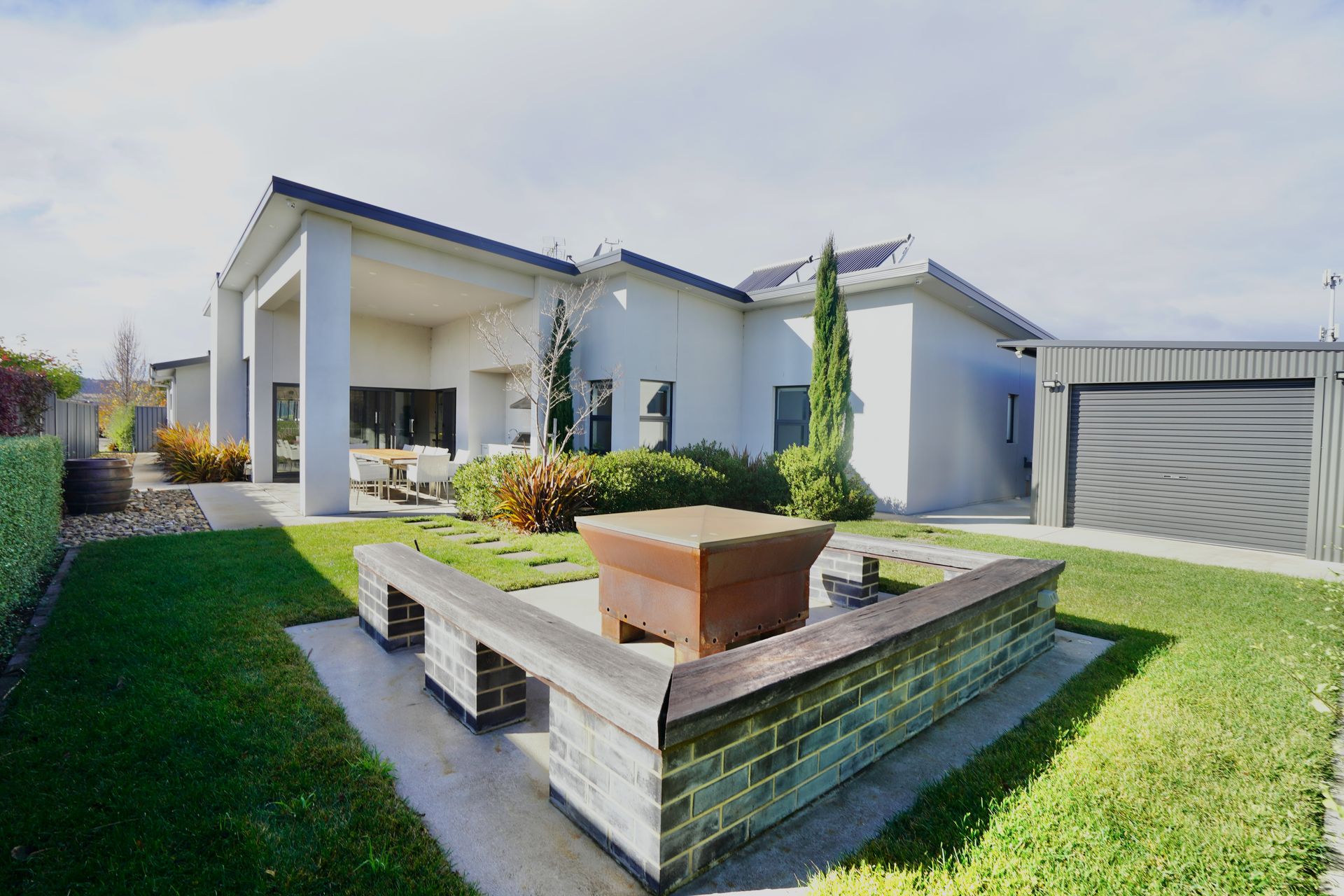This space flows seamlessly out to the outdoor entertaining area, complete with a full outdoor kitchen featuring a large BBQ, sink, and prep area, along with undercover seating overlooking the yard and firepit.