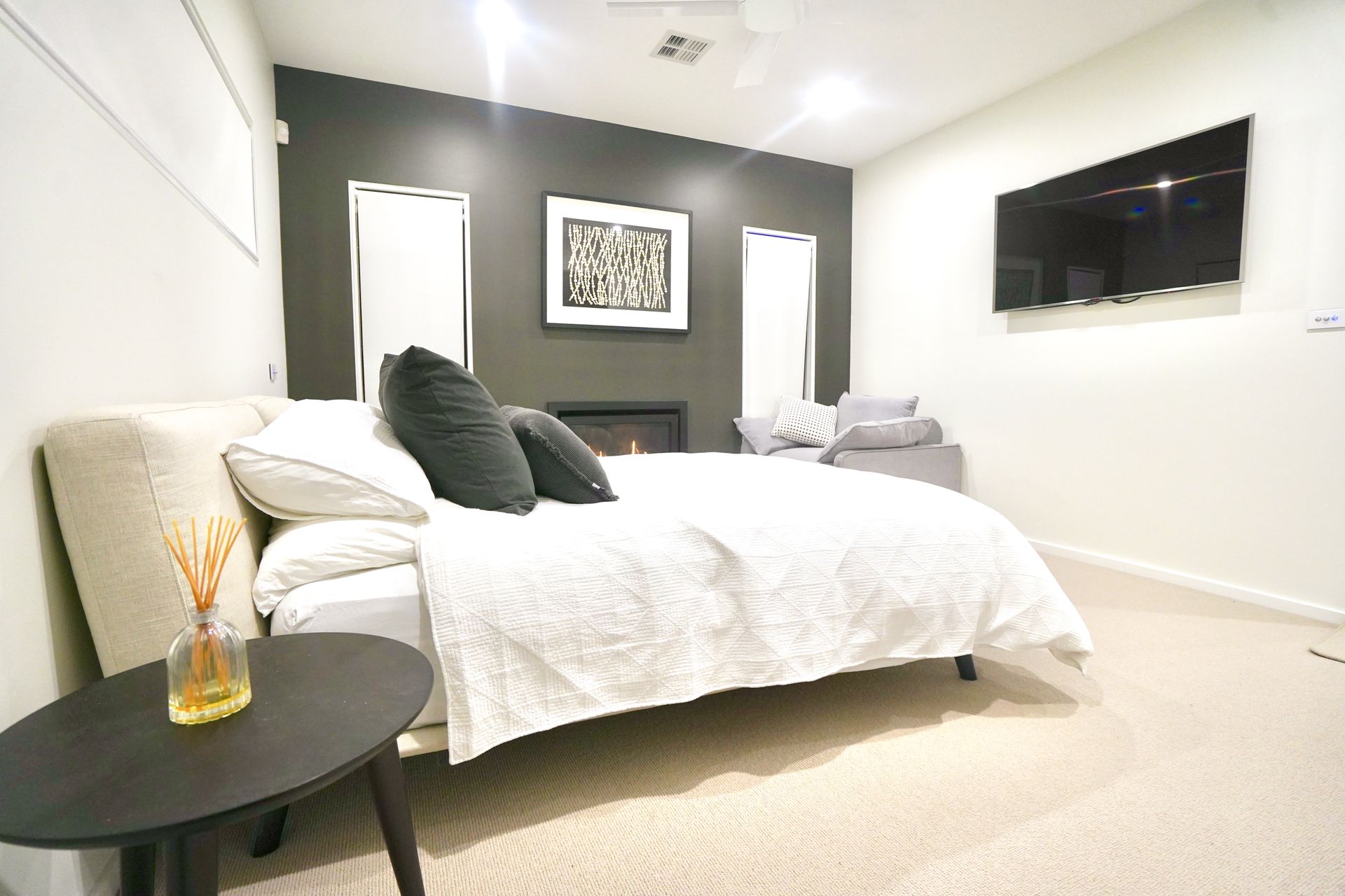 The master bedroom features a queen bed, built-in gas fireplace, spacious ensuite, walk-in robe, and a single fold-out sofa.