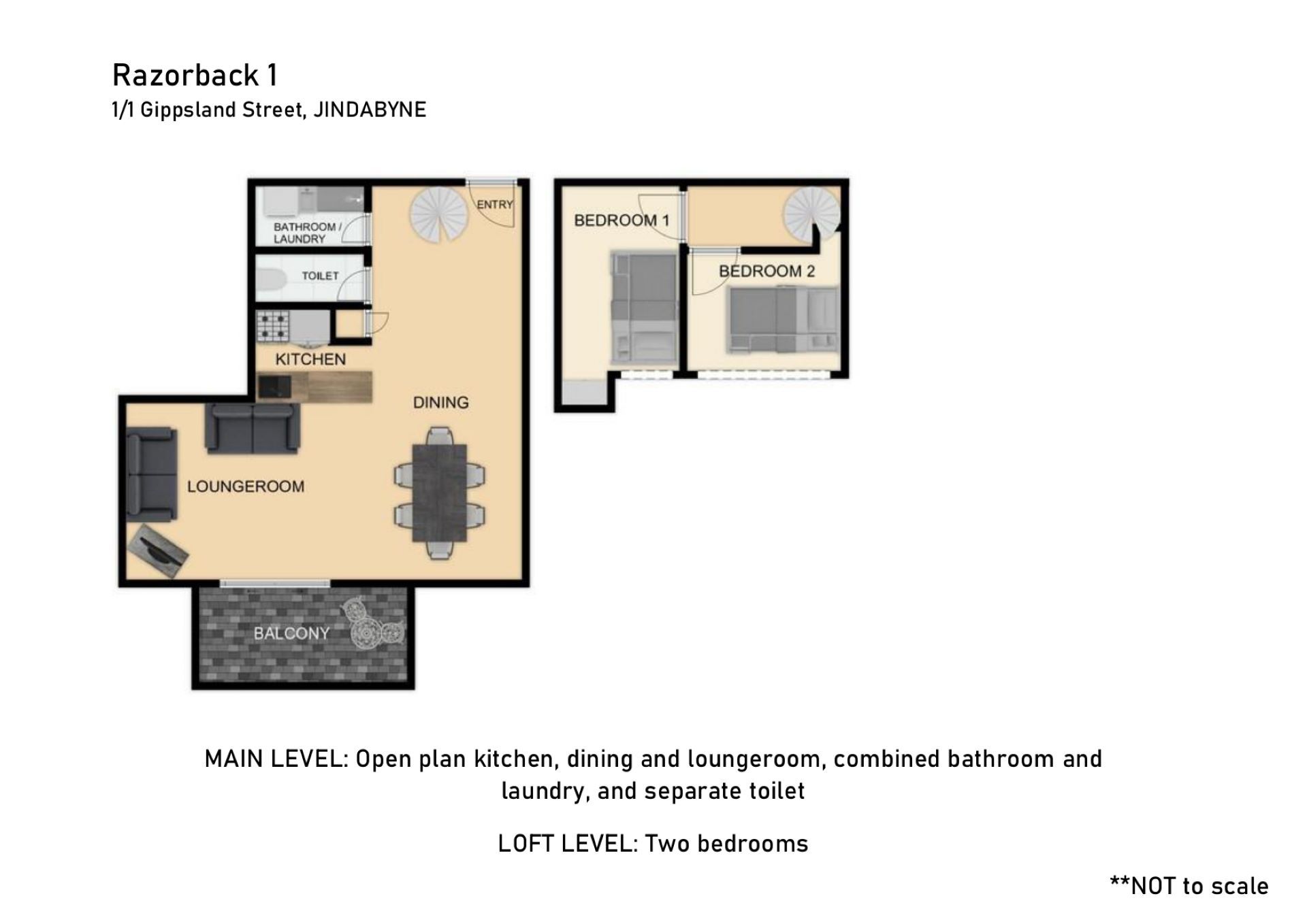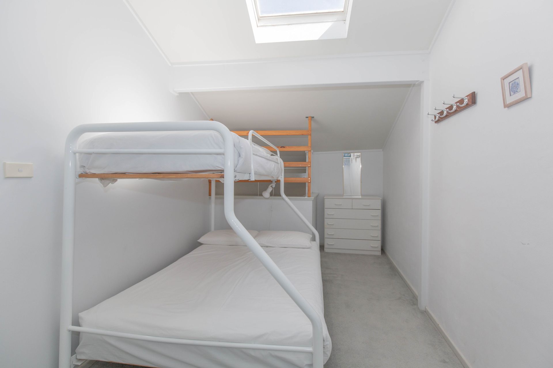The bedrooms are located upstairs and both have a tri-bunk. The living are has air-conditioning and the kitchen, lounge, dining is all open plan and lead onto a balcony overlooking town towards the lake. There is a combined bathroom and laundry with washer and dryer and a separate toilet.