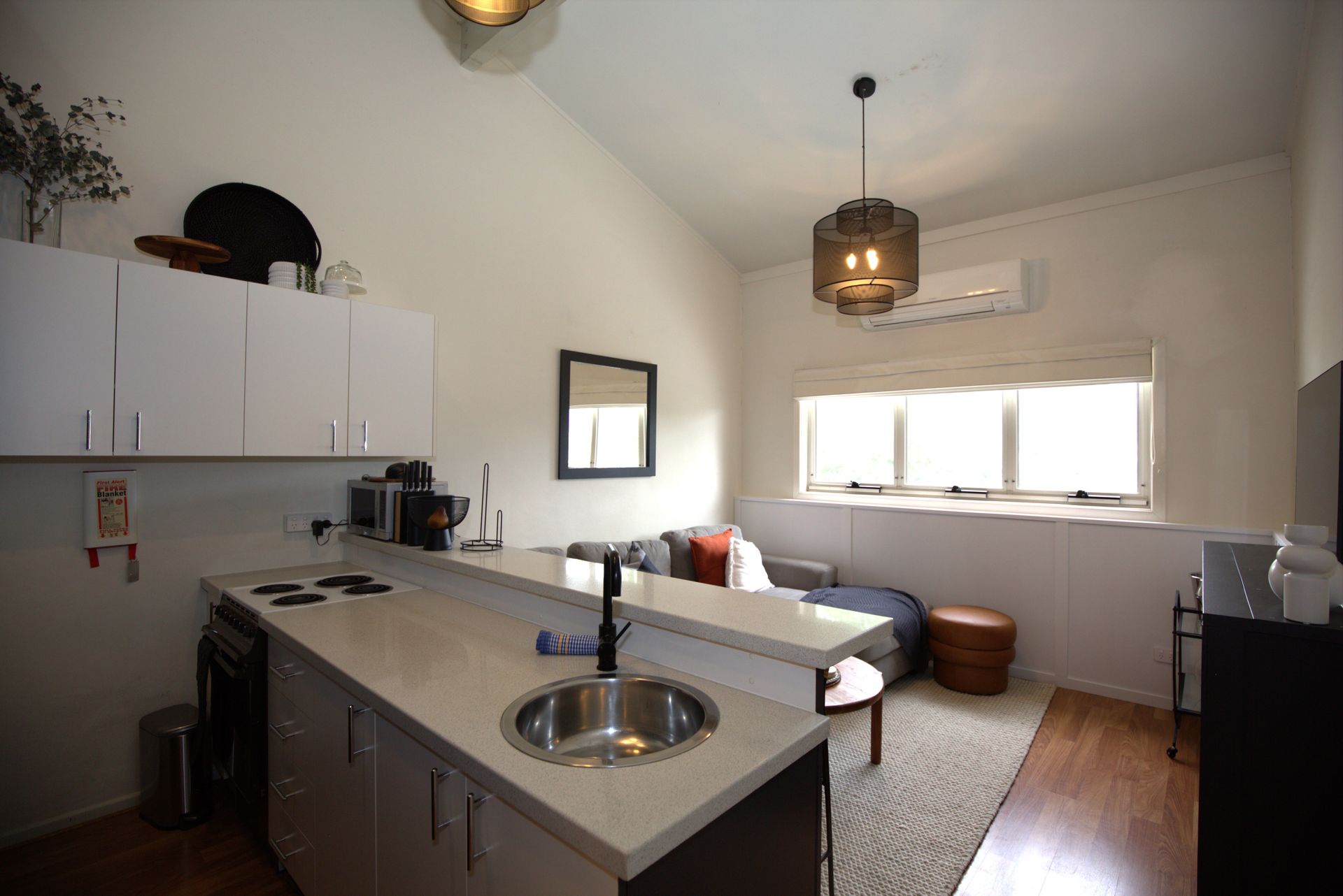 The one bedroom loft has a King bed to rest after a day out exploring. It has open plan kitchen with breakfast bar including coffee machine, dining overlooking the loungeroom, complete with a cocktail station to enjoy. The bathroom is combined with the laundry with combination washer dryer and a separate toilet. This modern, newly refurbished apartment with WiFi is right in the centre of town with parking at rear of the building, plenty of popular cafes, restaurants and the supermarket are all within a stones throw of the front door. The reverse-cycle air conditioning and ceiling fan will keep you feel comfortable anytime of year.