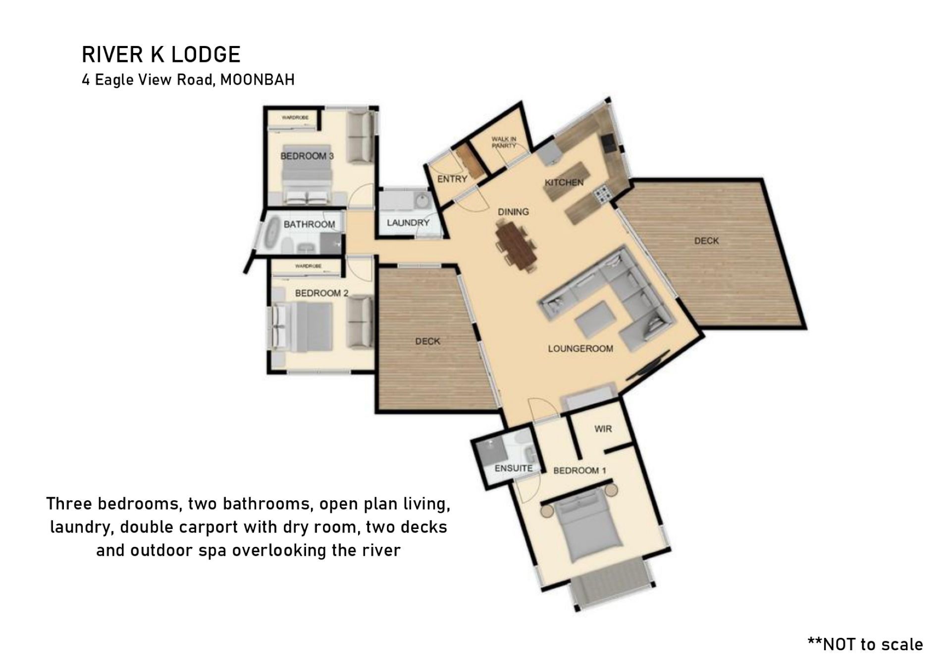 Stay with us and enjoy everything River K Lodge has to offer, with an open plan kitchen and living area, three generous bedrooms, all with scenic outlooks. The main bedroom with a queen bed, ensuite, walk in robe and a sun nook then the two remaining bedrooms each with queen beds, built in robes and 2-seater couches. Thermostat heated flooring and a built-in wood fireplace as well as reverse cycles throughout, ensures the house stays warm in the winter months.