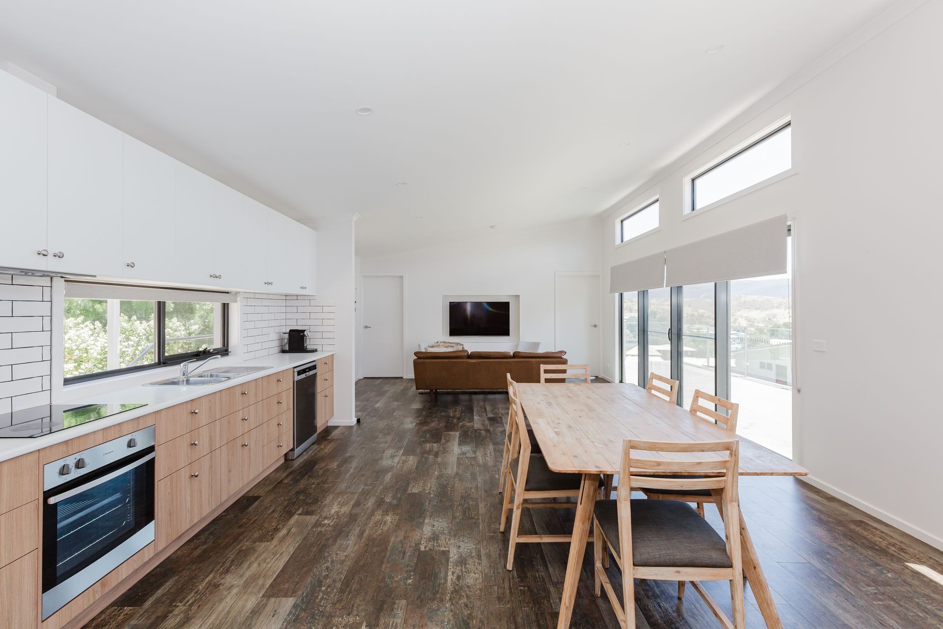 The single galley kitchen combines into modern living with the dining and loungeroom, which leads out to the large balcony overlooking the mountains.