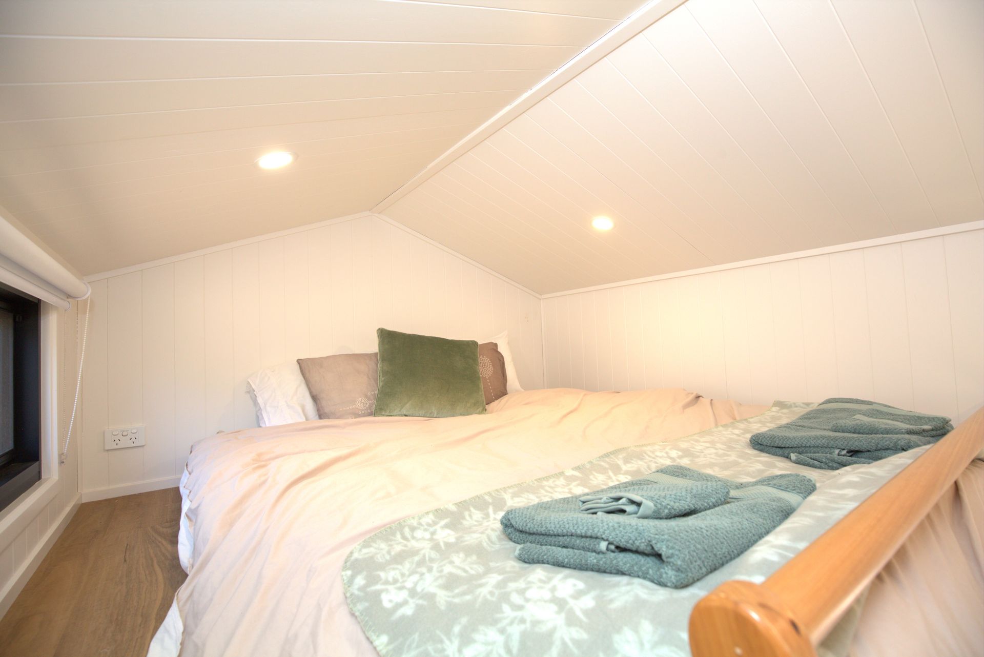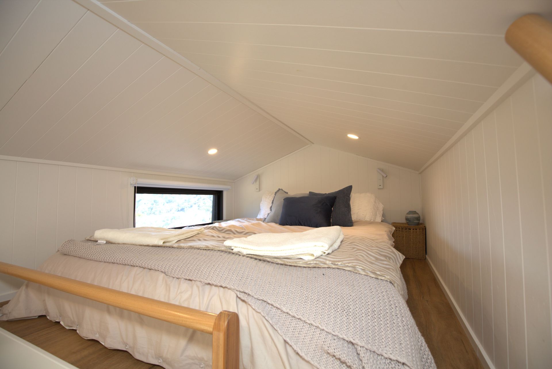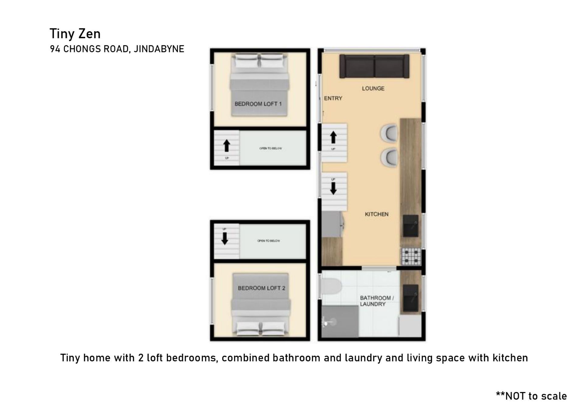 The space sleeps four guests on two queen floor beds on separate lofts that are open to the living space.
