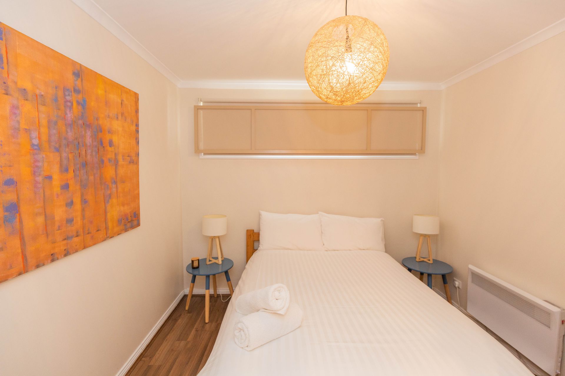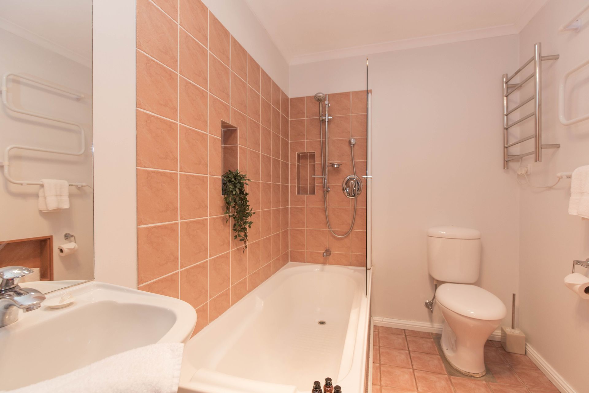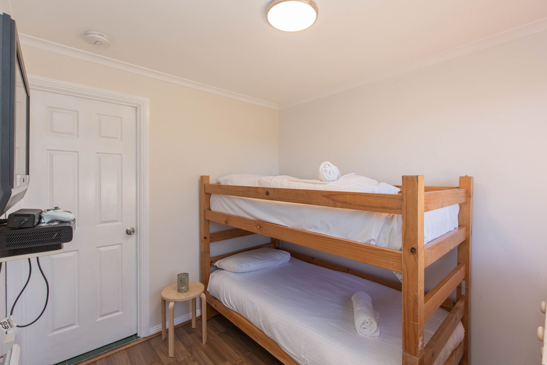 Three bedrooms comfortably sleep six guests across one queen, one double and one bunk room, all with electric heaters. The bathroom has a shower over bath and the unit contains a fully equipped laundry with both washing machine and dryer and second toilet.