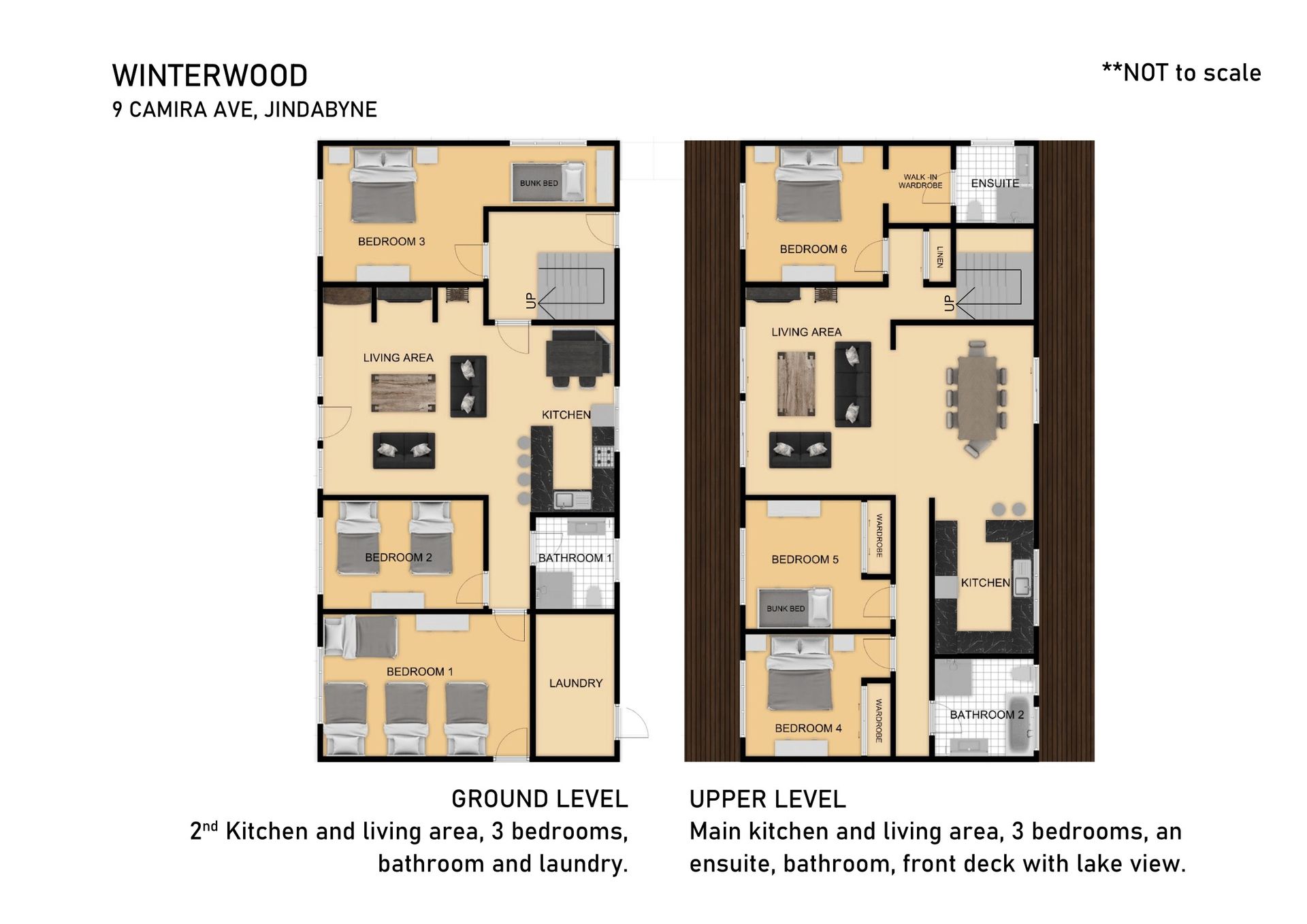 Downstairs consists of three bedrooms; one room with a king and set of bunks, another with two singles and the third with four singles. Upstairs, two rooms have queen beds, one with ensuite and the third with a set of bunks.